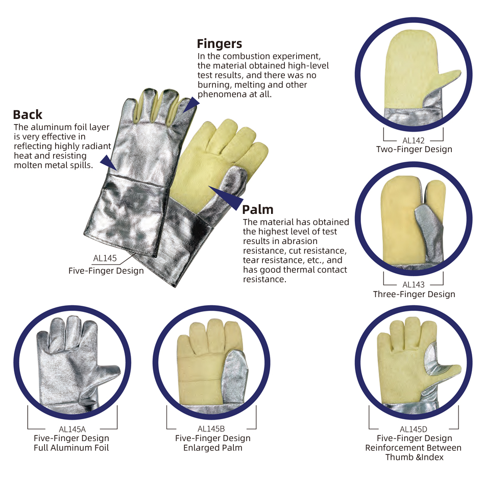 • Radiant Heat (EN ISO 6942): The superb aluminized gloves exceed the highest class (Level 4) requirement in the radiant heat performance test.