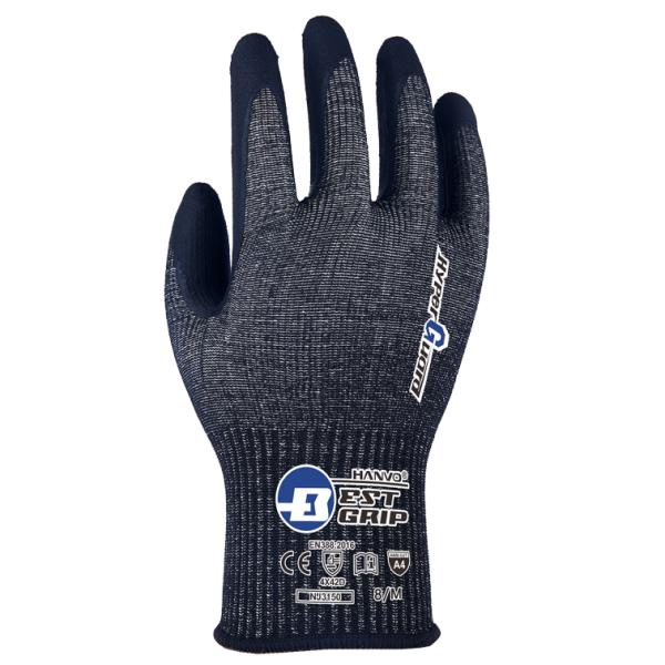HANVO NJ3150Q ANSI CUT A4 Cut Resistant Work Gloves, Abrasion Resistant, Nitrile Palm Coated, Thumb Reinforced, 13 Gauge HPPE/Glass Fiber/Steel/Polyester Shell