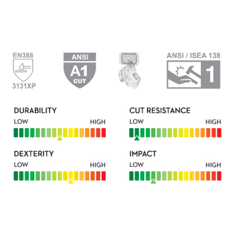 • Impact Protection: Low profile, dorsal TPR full finger & knuckle guards prevent injuries from impacts and knocks. In addition, impact absorbing XERO palm padding reduces shock and vibration from hand tools.