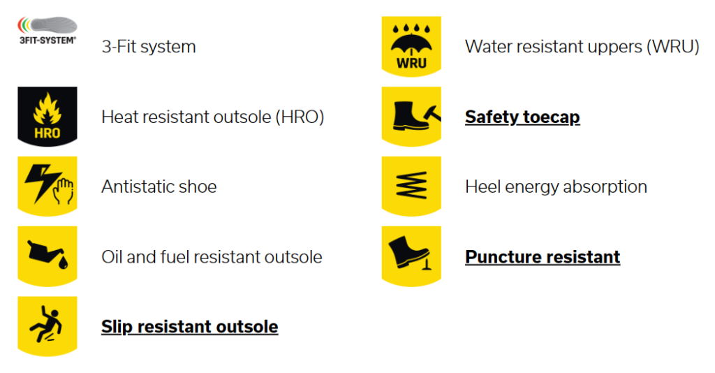 • S3 Water Resistance: S3 safety shoes are suitable for work in an environment with high humidity and presence of oil or hydrocarbons. These shoes also protect against perforation risk of the sole, and foot crushing.