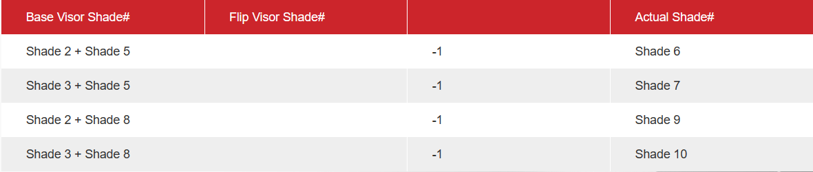 4.When base visor is in clear lens, flip visor cannot in Shade 8, as this will be harmful to eyes. Reason: Base visor is in bigger size, clear lens has no protection for light even the flip visor is in Shade 8. Light will be come through from clear lens that is not covered by flip visor Shade 8 (Smaller size lens) area.