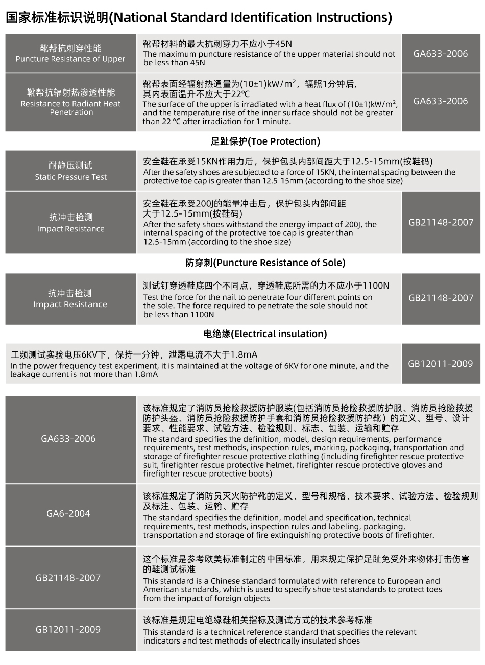 • Puncture Resistant Heat Resistant & Anti-Slip Sole: The puncture-resistant layer of the mid-sole covers the entire sole and is made of high-strength Aramid synthetic fiberboard. The thickness of the inner sole is greater than 4.5 mm. The puncture resistance of the finished shoe is greater than 1700 N. The outer sole is made of high-quality heat-insulating rubber, which is heat resistant, oil resistant, weak acid and alkali resistant and anti-slip. The anti-slip landing area is greater than 70%, and the anti-slip tooth pattern is greater than 4 mm.
