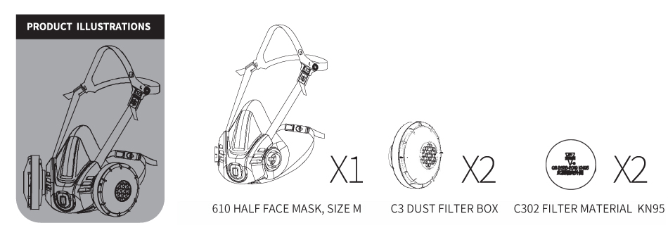 • High-Efficiency Filtration: The half mask provides protection from dust particulates. It accepts C3 dust filter box and C302 dust filter cotton as replacements with no less than 95% particulate filtration efficiency.